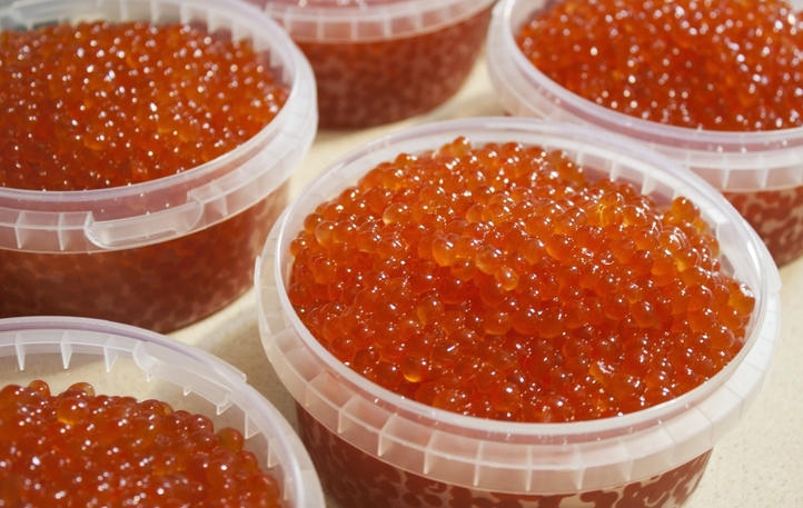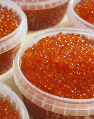 Малосоленая, сухая, зернистая икра рыб лососевых пород высшего качества.